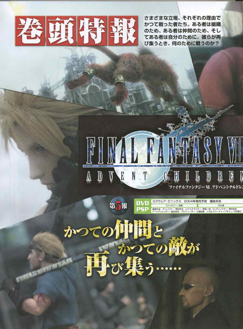 Final Fantasy 7: Advent children släpps någon gång under 2004 i Japan. Formaten blir då UMD (till PSP) och DVD.