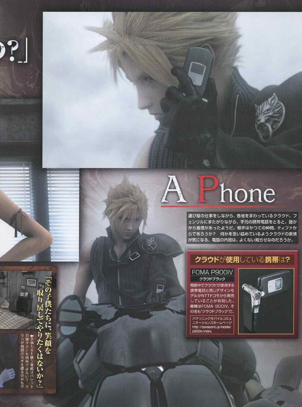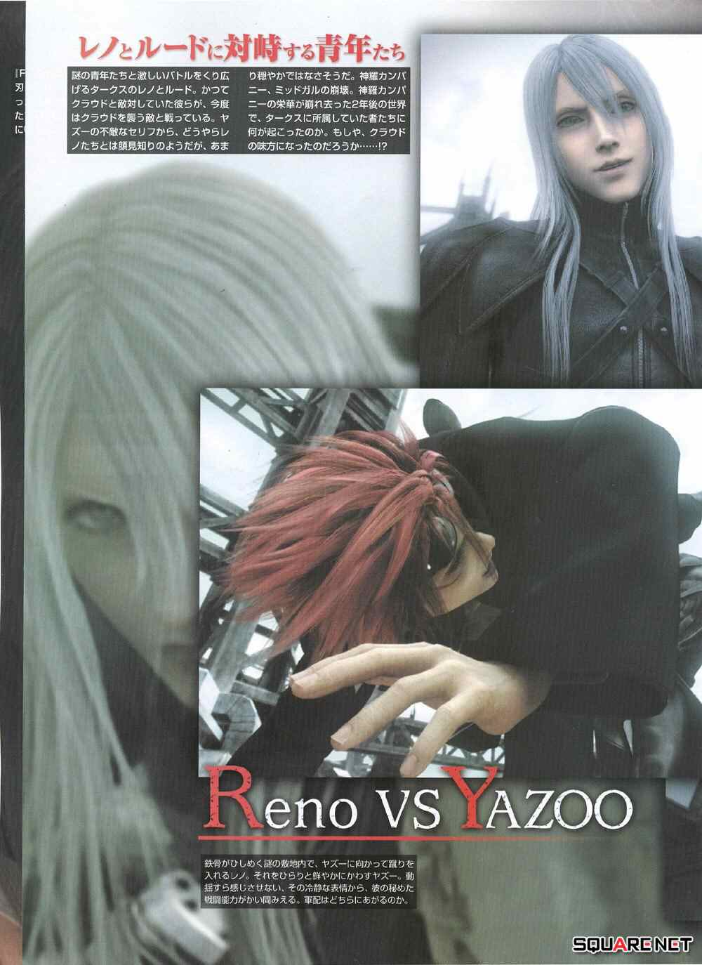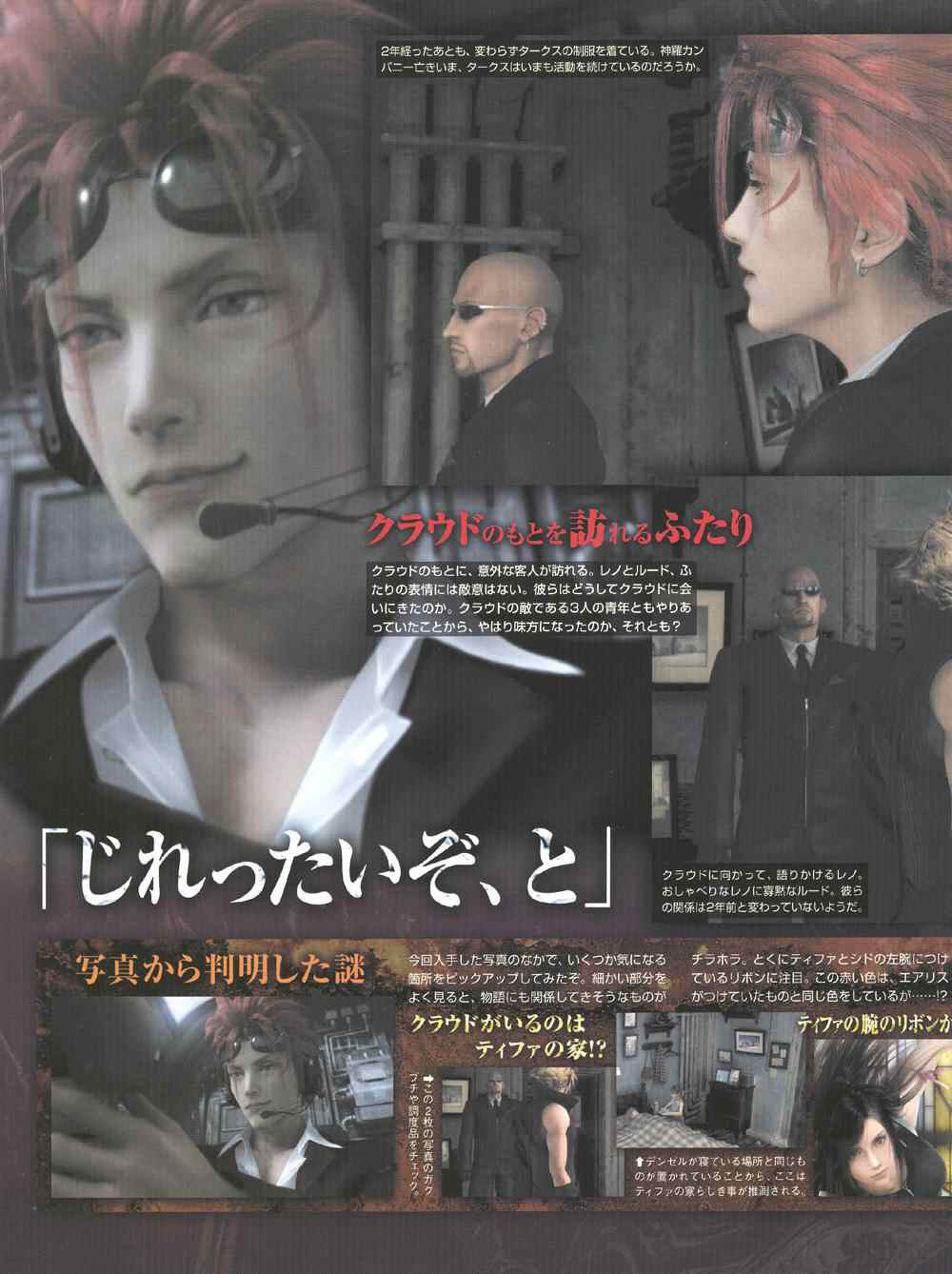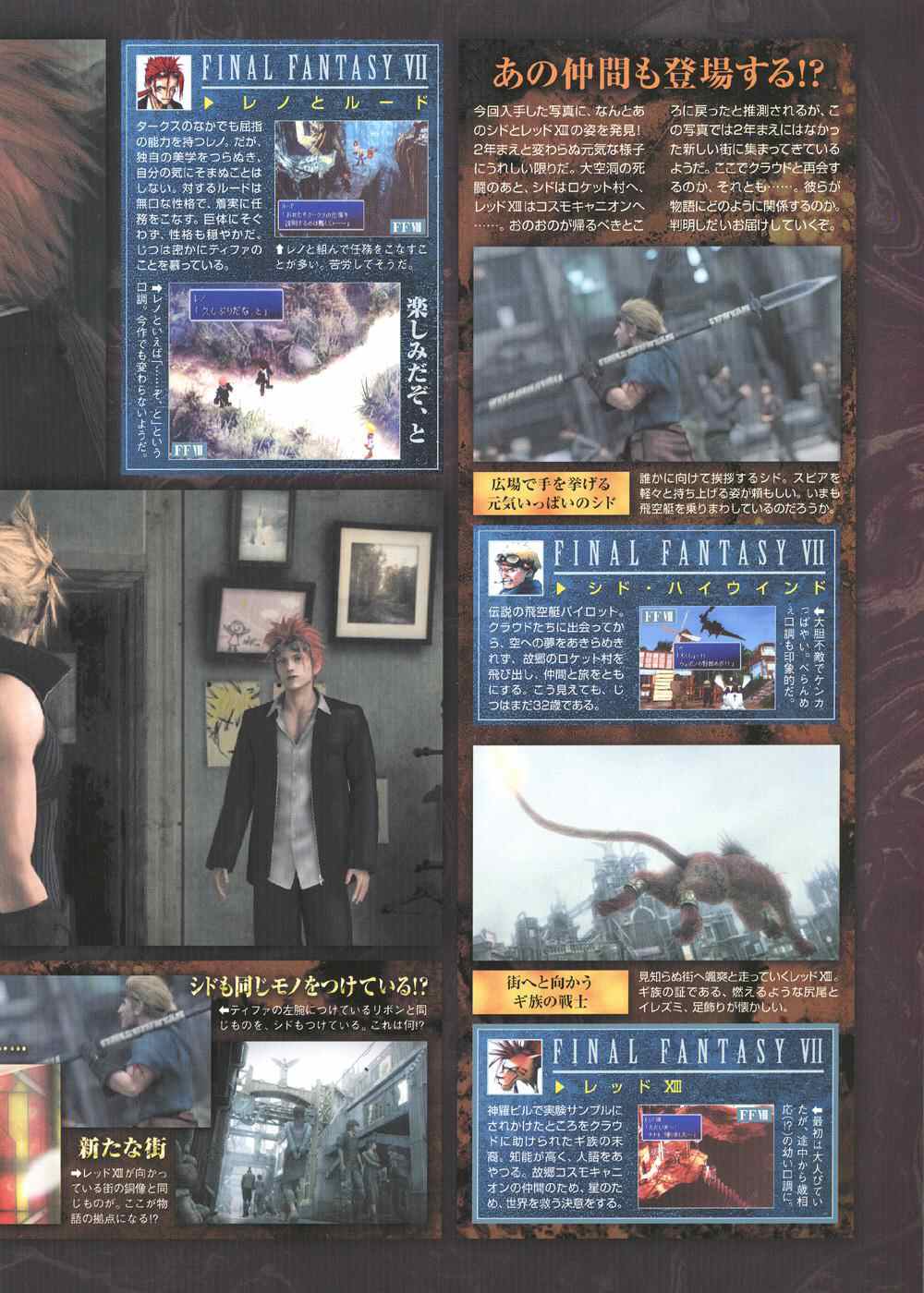 Här följer en del bilder som vi tidigare sett , fast då i mindre format. På bilderna ser man tydligt bl.a. Cloud med en mobiltelefon ( som även skall finnas att köpa i Japan inom en kort tid ). Några större bilder på Tifa är också tillgängliga och slutligen finns det en bild där Reno kämpar emot Yazoo. Allt fler hemligheter och spännande intriger dyker upp…