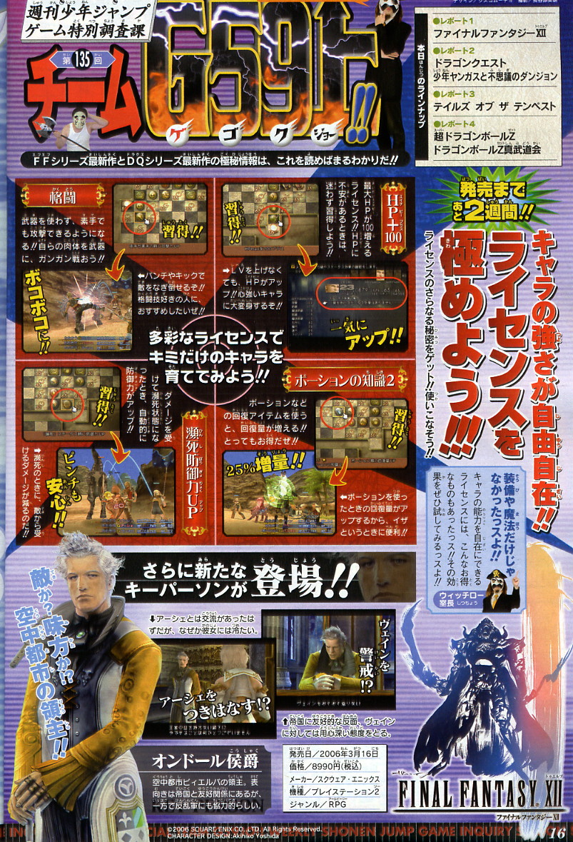 Angående Licens-systemet så har mer info kommit. Man kan lägga ut plattor på ett schackbräde och dessa ger bonusar till karaktären. Olika markörer som kan läggas ut är bland annat “HP +100”, “Desperation Defense Up” (vid låg HP ökar Def-värdet), “Potion Knowledge 2” (effekten av olika Potions höjs) samt “Martial Kind” (har något med vapenlös strid att göra).