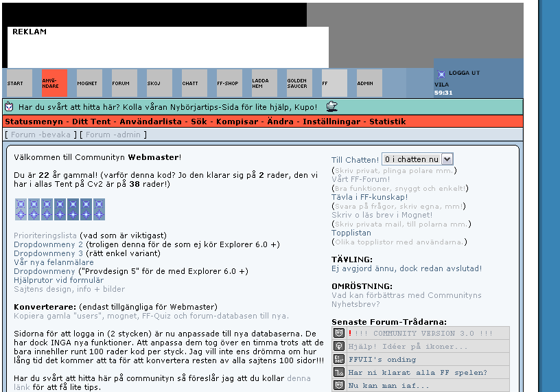 Så här såg det ut då vi Beta-testade communityn. Ingen vacker syn direkt samt en massa saker som va upp bara på prov. Arbetet med communityn började faktiskt rätt tidigt, och då med att jag kom på en design. Sen byggde jag på med idéer på funktioner och liknande. Sen skulle allt börja kodas och det var ett massivt jobb. Först av allt så gjorde jag om databaserna totalt för att göra dem snabbare och effektivare. På grund av detta var jag tvungen att skriva om all kod för hela communityn, detta tog nog 1-2 månader. Samtidigt som jag ändå fixade det så förbättrade jag en massa kod. Vi har monsterexempel som en sida där en kod på 500 rader förminskades ner till 4 rader, eller mer vanliga 50 rader blev 2. De gjorde exakt samma sak, bara snabbare och bättre.