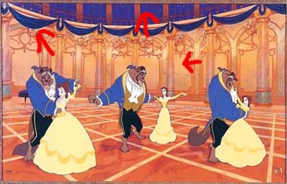 Jag har här två bilder, en som föreställer Sora som slåss, och en som föreställer Skönheten och Odjuret som dansar i bal rummet (från filmen). Om man granskar bilderna noga så ser man ganska många likheter mellan dom båda rummen. Bland annat draperierna som hänger ner runt hela rummet, väggarna ser likadana ut på båda bilderna. Ja, ni får se efter själva.