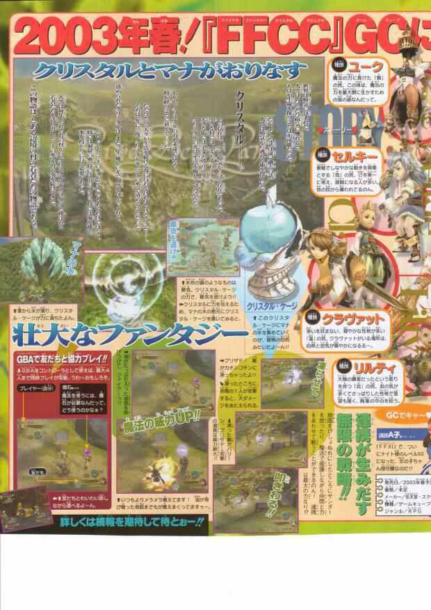 Här nedan ser du 2 st scans från det kommande Final Fantasy: Crystal Chronicles till GameCube som just nu är under utveckling. Intressanta bilder, men inte nya! Dem har nu funnits ett tag och dem flesta av er har nog redan sett dem, men jag tycker att alla ska se dem för dem är verkligen sevärda. Spelet väntas att bli släppt under våren i Japan i år.