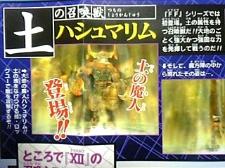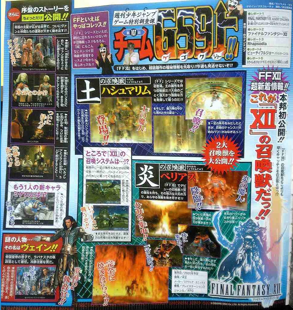 En annan bra nyhet är att vi nu också får ny information kring några scans som tidningen JUMP publicerat. Det handlar om Summons i Final Fantasy XII. Hashmarim och Berias är två av dessa som ska finnas med i spelet. Hashmarim är en summon av typen “Earth”, d.v.s. jord, och Berias är av elementet eld. Båda dessa återfinns också i klassikern Final Fantasy Tactics.