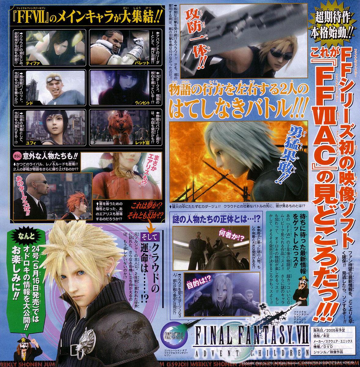 Tidningen JUMP Magazine i Japan har publicerat en ny scan på den kommande DVD-filmen Final Fantasy VII: Advent Children. Den scannade sidan består dock endast av två nya bilder. En på Cloud och en annan där Kadaj poserar. Med detta kan vi bara konstatera att det är väldigt lite information som släppts, men det kan vara kul att se i väntan på filmen.