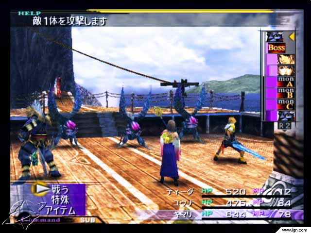 I Final Fantasy X finns det gamla och nya saker. Något som kanske anses nytt är ju att man inte har med ATB utan allt baseras på ett slags tur-ordnings-system där en lista visar i vilken ordning alla får slåss. SÅ man behöver aldrig stressa på sina attacker. Man hade inte med ATB i de första Final Fantasy, så det är inget nytt, men ändå. Vissa kommandon finns kvar. Detta är till exempel “Item”, “Blk Mgk”, “Summon” och “Attack”. Det som har funnits med länge är de goda krafter som hjälper en strid. I Final Fantasy 6 kallades de Espers, i FF7 kallades de Summons, i åttan Guardian Forces, i nian Eidolons (som jag gillar bäst) och nu i FF10 kallas de för Aeons. Det som är helt nytt är att när man har åkallat dessa får man utföra kommandon med dem i stället för att de försvinner efter en attack. Detta är mycket bra tycker jag.