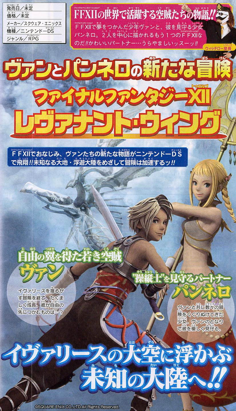 Final Fantasy XII Revenant Wings är namnet på det nya spelet. Det följer Vaan och Penelo på ett nytt äventyr. Mer än så vet vi ännu inte om detta spel. Dess grafiska stil är lite mer åt Itadaki Street-hållet. Alltså mer “barnslig”.