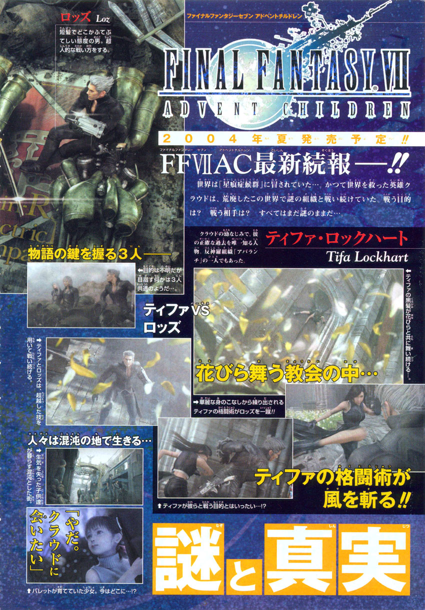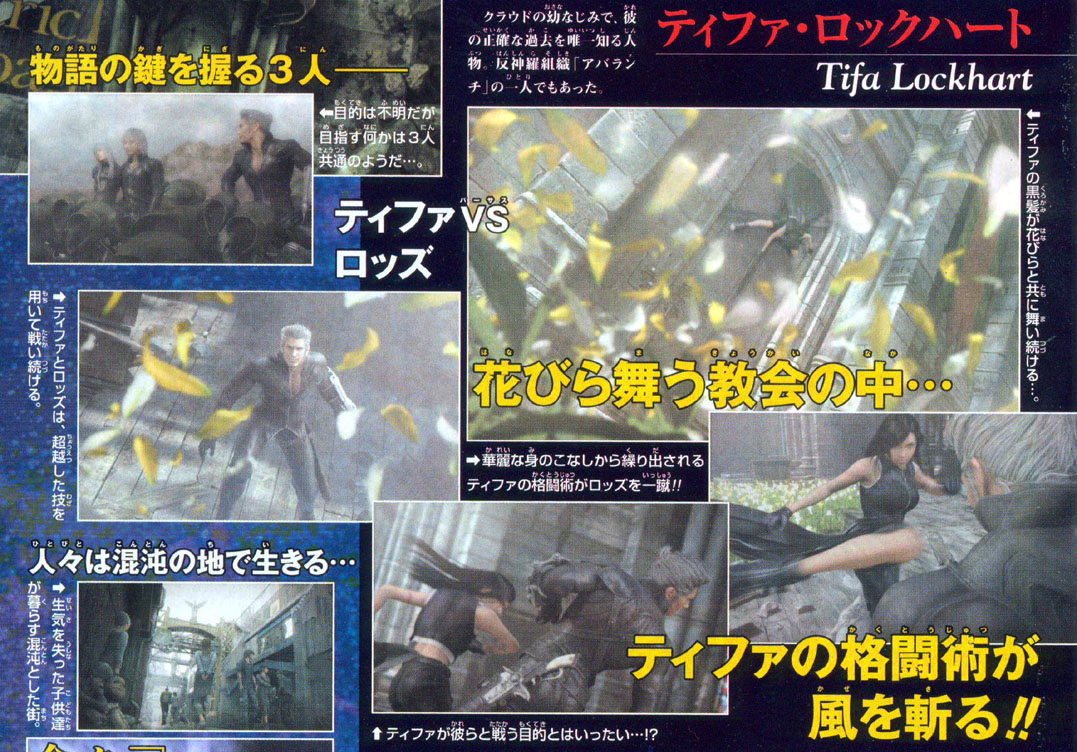Några nya scans som visar mer av FF7:ac. Vissa av bilderna har vi redan visat i våra nyheter men några är nya. Bland annat ser vi Tifa springa upp för en dörr i Aeris kyrka i slummen. Troligen gör Tifa nån specialattack. Den lilla flickan på bilden är Marlene (men jag tycker hon ser för gammal ut, men men …).