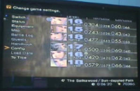 I demot så kan man aldrig få upp huvudmenyn, alltså där man byter utrustning, ändrar med Gambits, kollar sina Items, osv. Men på en gammal bild så ser vi hur menyn ser ut. Den är från E3 2004 och menyn har säkert förändrats en hel del sen dess. På våran FFXII-sajt har vi ytterligare analyserat menyn utifrån den bilden.