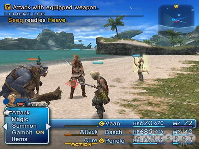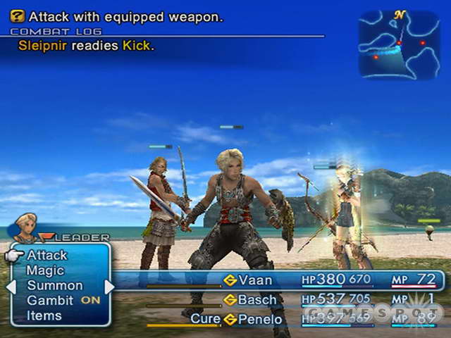 De två andra i ens party kan man också styra i strid, om man vill, genom att sätta Gambit på eller av i stridsmenyn (kan göras när du vill). Är Gambit på så attackerar de efter ett speciellt system, kanske de bara helar, eller bara slåss. De datorstyrda gubbarna är faktiskt rätt smarta, om fienden till exempel är svag mot Fire så kommer de att kasta just Fire på denne. Om man aktiverar Gambit för alla så går spelet på autopilot och man kan lugnt luta sig tillbaka. Detta är perfekt i enklare strider eller då man vill samla.