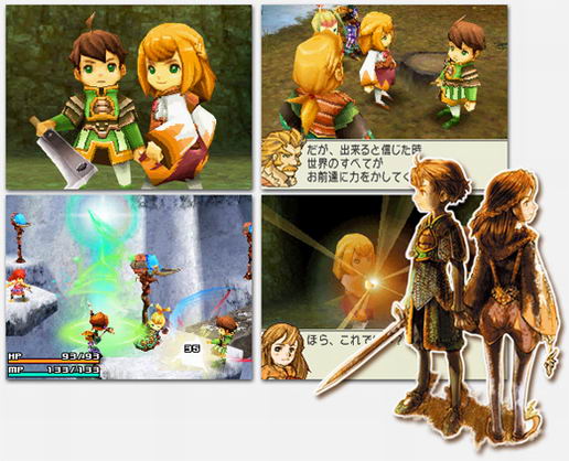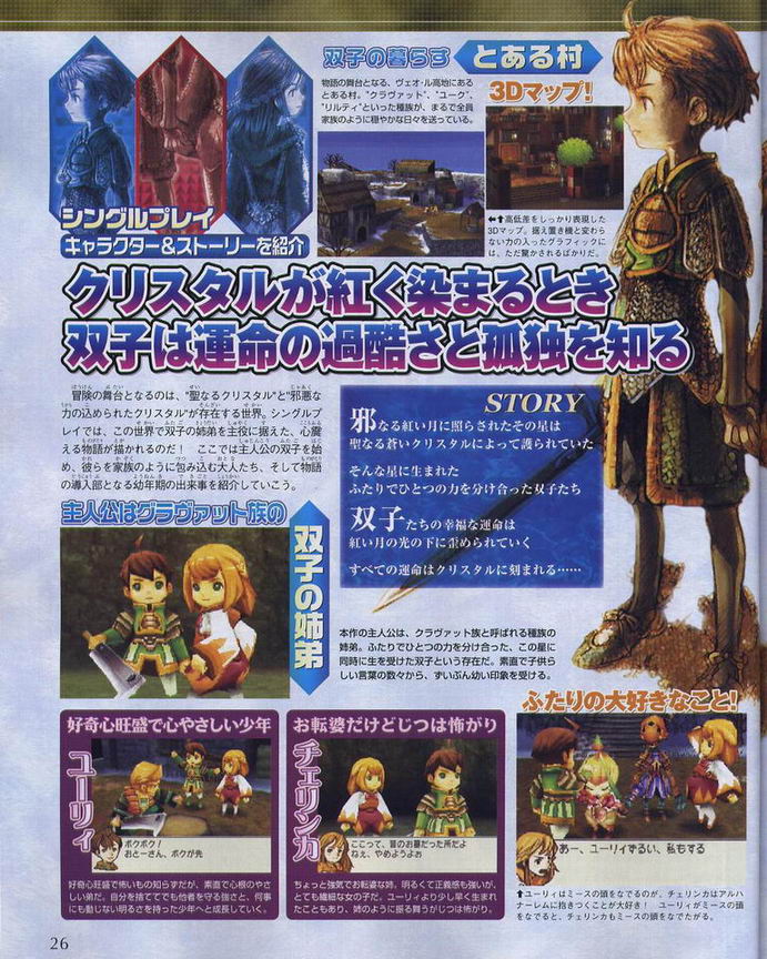 Spelet handlar om två huvudkaraktärer, som dessutom pratar. Pojken heter Yuri och flickan Cherinka, de är tvillingar. Spelet handlar även om de två kristaller som existerar - den goda, och den onda. Gällande tvillingarna så härstammar de från Clavat-rasen (även de andra raserna från FFCC är med). Till sin hjälp har syskona sin far Ratov som lär dem att slåss, Alhanarlem (en Yuke) som lär dem magi, samt Mees Vrimm (en Liltie) som lär dem alkemi.
