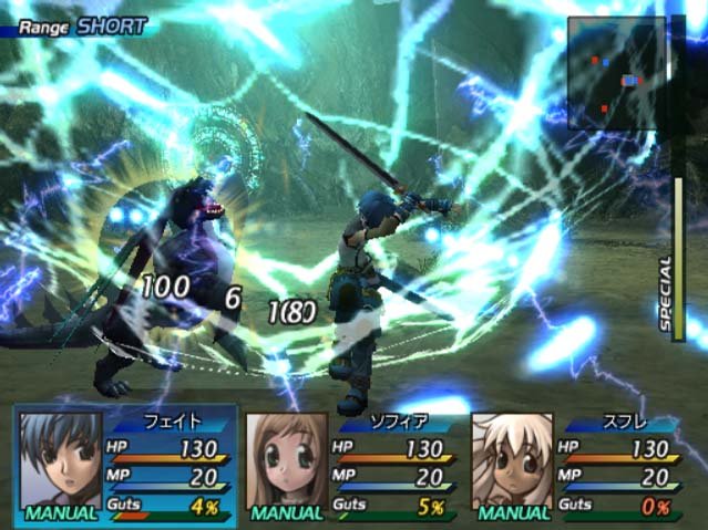 Vi får inte heller glömma bort Fury-mätaren, som är en av de viktigaste detaljerna i striderna. Denna mätare står vanligtvis på 100% (den är full helt enkelt) när man går in i striden, vilket är tur då denna är nödvändig när man ska attackera. Varje attack drar av en viss procent på din Fury-mätare och när den står på noll så kan du inte attackera mer, detta är dock lätt fixat genom att bara stå still ett par sekunder så att den på nytt fylls upp. “Jaha” säger ni nu, “det är ett rollspel, man står väl alltid stilla?” men där misstar ni er, striderna är en blanding mellan de gamla älskade rollspelsstriderna och, för att ta ett exempel, Kingdom Hearts. Fienderna rör sig fritt på kartan, och kommer springa efter dig om du kommer för nära, när du nuddar en fiende så kommer den vanliga bildförvrängningen och du är i en stridszon, men istället för att stå still och vänta på din tur så rör du dig fritt i denna zon och kan attackera när som helst. Vi får inte heller glömma att du kan hoppa runt mellan karaktärerna i striden, du behöver alltså inte bara slåss med Fayt, utan kan även använda dig av Sophia eller någon av de andra karaktärerna.