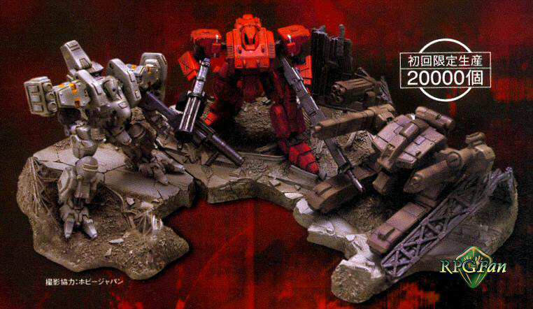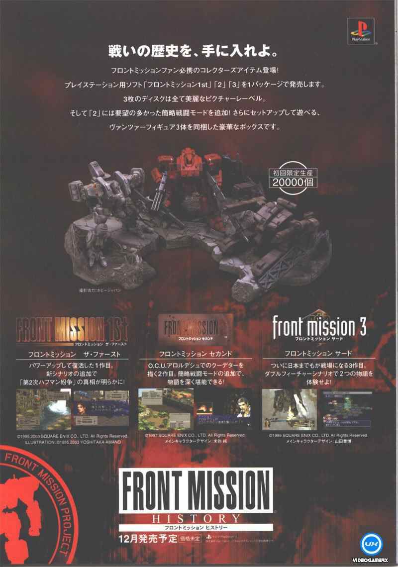 Andra spelet är Front Mission History. FM:H är en samling av tre stycken Front Mission-spel. Front Mission 1st (som för övrigt släpps i Japan den 23:e denna månad), Front Mission 2 samt Front Mission 3. FM2 & 3 släpptes ursprungligen till PS1 och är inte uppiffade på något sätt. Samlingen släpps den 11:e december i Japanska butiker och kommer att kosta runt 10.000 yen som är runt 700 i sek. Vad som bör tilläggas är att FM:H bara kommer att släppas som limiterad version. De första 20.000 exemplaren säljs tillsammans med ett gäng FM-figurer som ni kan se nedan.