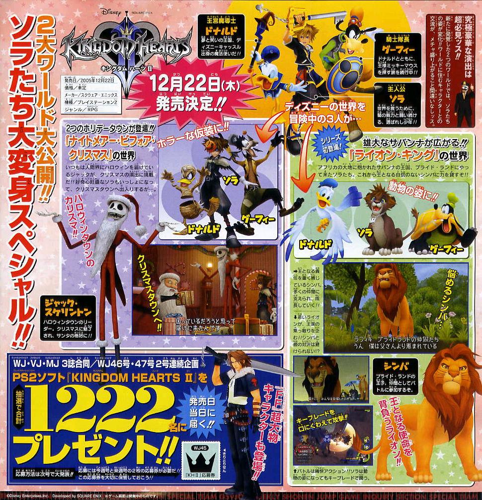 Som de flesta nog vet och känner igen från Kingdom Hearts så byter Sora och gänget skepnad när de kommer till olika världar, som hos Lilla Sjöjungfrun där Sora blir en sjöjungfru, Långben en sköldpadda och så vidare. Vi får nu se hur grabbarna kommer att se ut i Lejonkungens värld och hur de kommer se ut i Nightmare before Christmas världen. Är osäker på om det är någon skillnad i den världen sen Kingdom Hearts, men ni får se hur de ser ut iallafall.